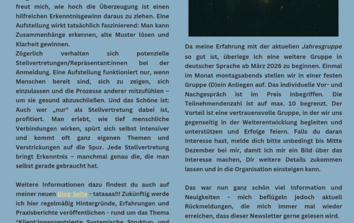 „In der Systemischen Familienaufstellung beeindruckten mich die Ruhe und das Einfühlungsvermögen, mit der/dem Frau Noll die Gruppensituation lenkte und damit allen Beteiligten ein sicheres Gefühl und die Möglichkeit gab, sich auf die Situation einzulassen. Dadurch entstand eine intensive und für alle Beteiligten hilf- und erkenntnisreiche Dynamik. Bei mir hat diese Erfahrung einen bleibenden Eindruck hinterlassen und mir in der Folgezeit neue Handlungsoptionen in verschiedensten Lebenssituationen sichtbar gemacht.“